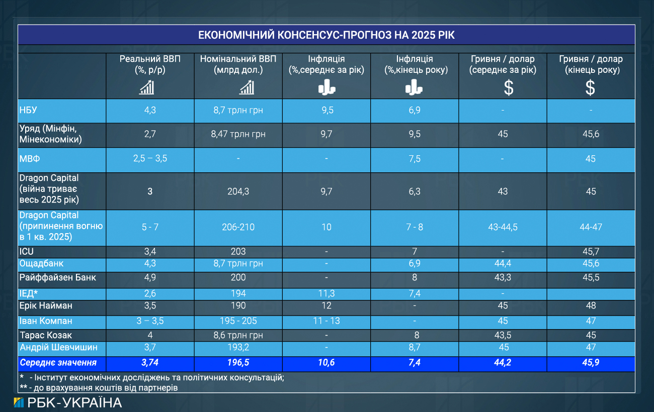 Редакція РБК-Україна звернулась до низки інвестиційних компаній, банків, відомих інвестбанкірів та аналітиків з проханням спрогнозувати основні макроекономічні показники України на 2025 рік.