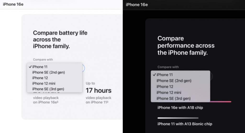 Якщо відвідати apple.com і переглянути сторінку iPhone 16e, у деяких розділах можна знайти випадаючі меню, що пропонують порівняння новинки з іншими пристроями компанії. Однак вибір обмежений лише п’ятьма моделями: iPhone 11, iPhone 12, iPhone 12 mini, iPhone SE (2020) та iPhone SE (2022). Решта iPhone просто не враховані.