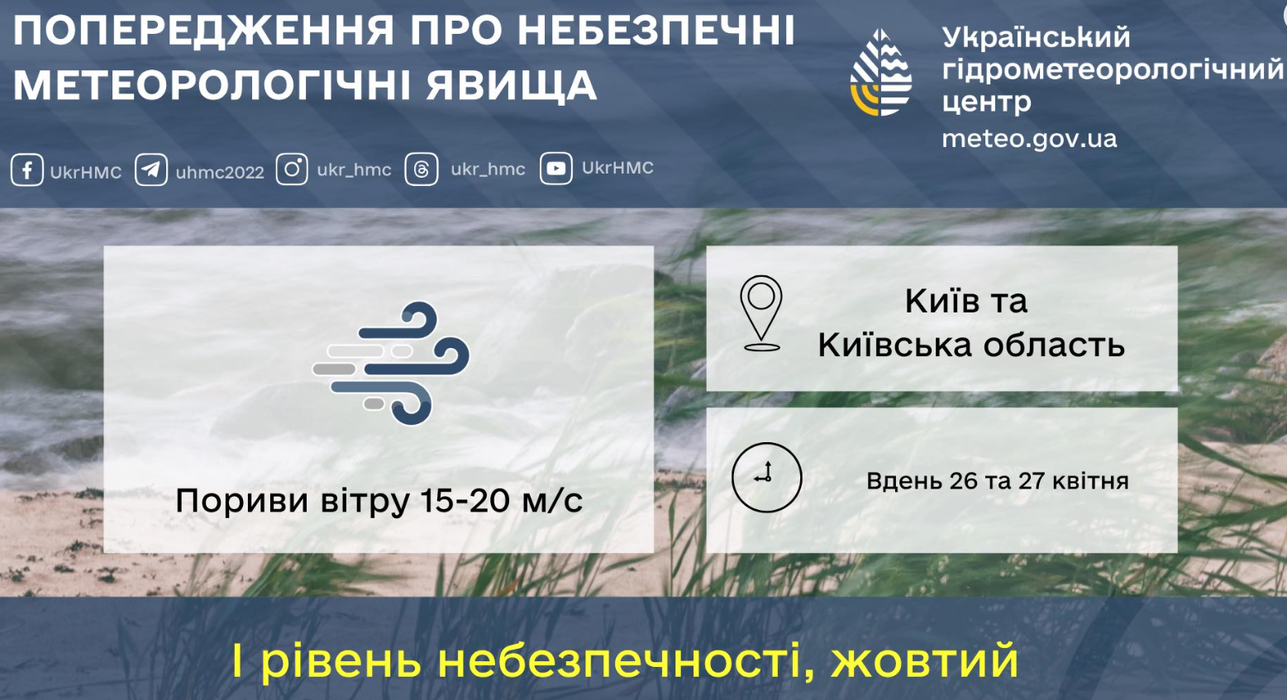 "Вдень 26 та 27 квітня пориви вітру 15-20 м/с", – повідомляє Український гідрометеорологічний центр у фейсбук