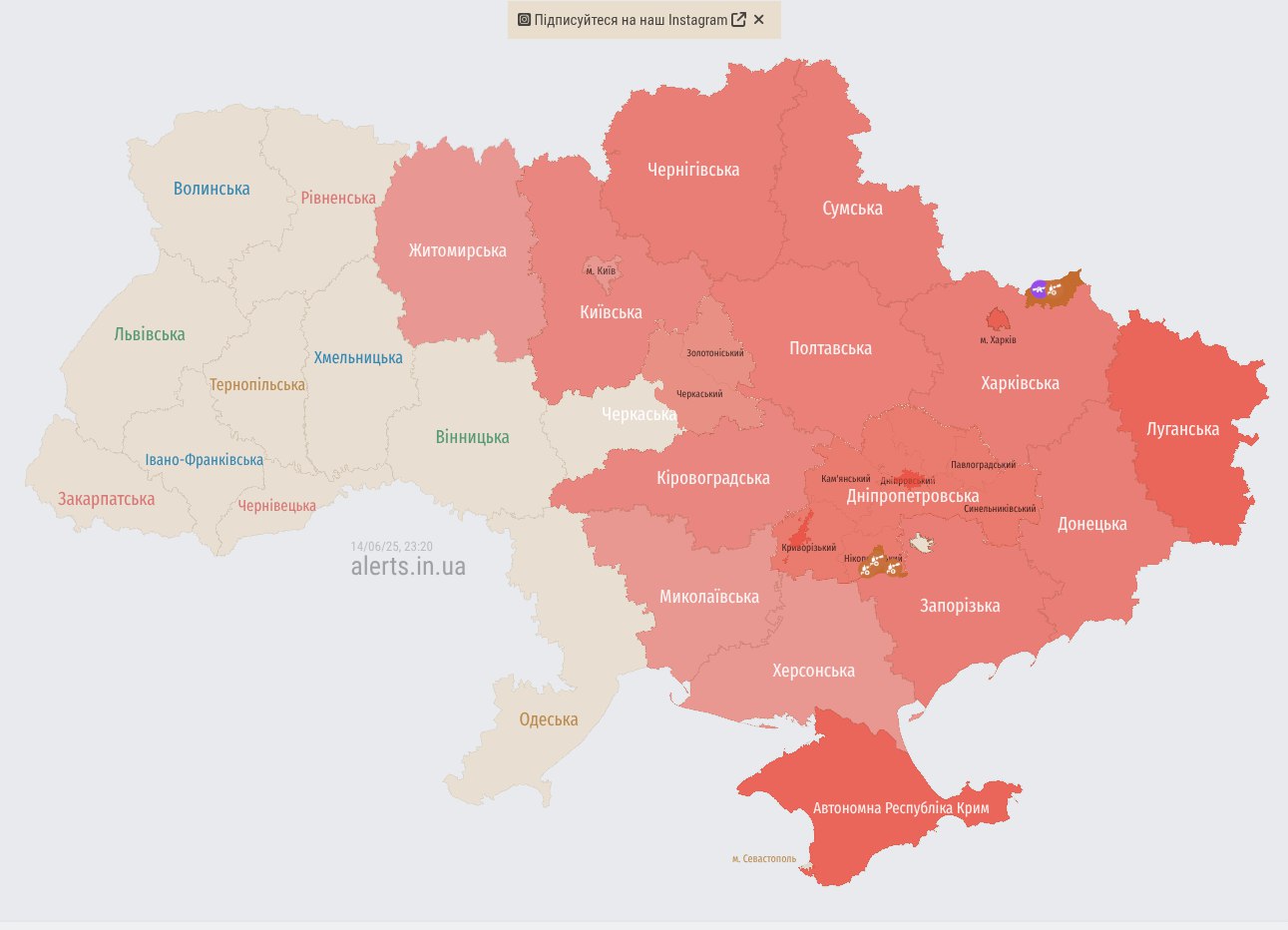 Станом на 23:20 карта повітряних тривог України виглядала так: