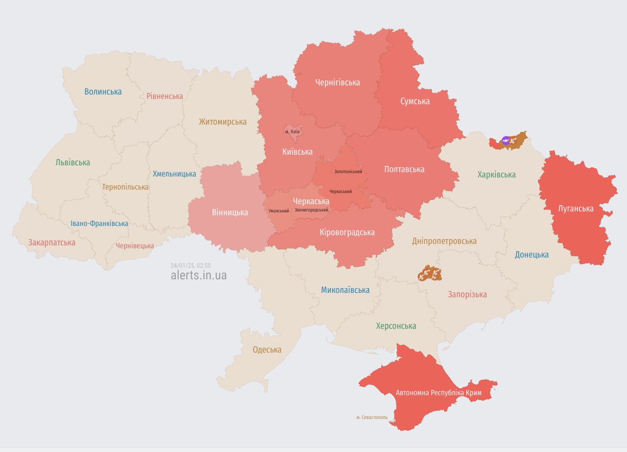 Станом на 02:50 мапа повітряних тривог України виглядала так: