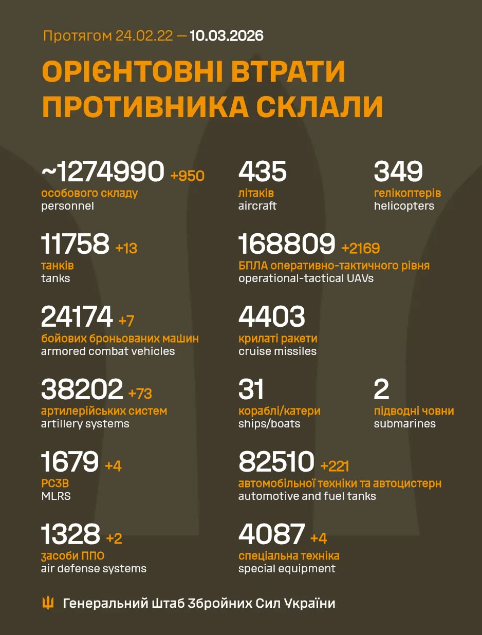 Загальні бойові втрати російських військ від початку повномасштабного вторгнення в Україну, з 24 лютого 2022 року по 10 березня 2026 року, становлять близько 1 274 990 осіб, зокрема 950 осіб – за минулу добу.