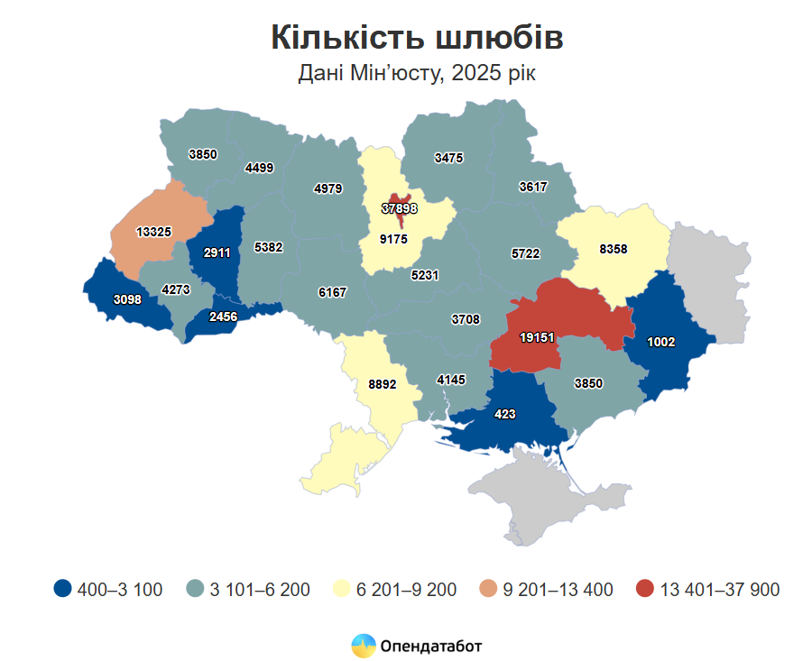 Як зазначається, у порівнянні з 2024 роком кількість зареєстрованих шлюбів зросла на 10%. Водночас аналітики зауважують, що ця тенденція спостерігається лише у трьох регіонах: у столиці, на Дніпропетровщині та Львівщині.