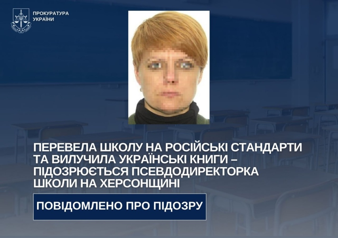 На Херсонщині заочно повідомили про підозру псевдодиректорці школи, яка перевела школу на російські стандарти та вилучила українські книги, у школі було створено «кадетський клас», де дітей змушували вивчати гімн держави-агресора та носити форму російського військового зразка.