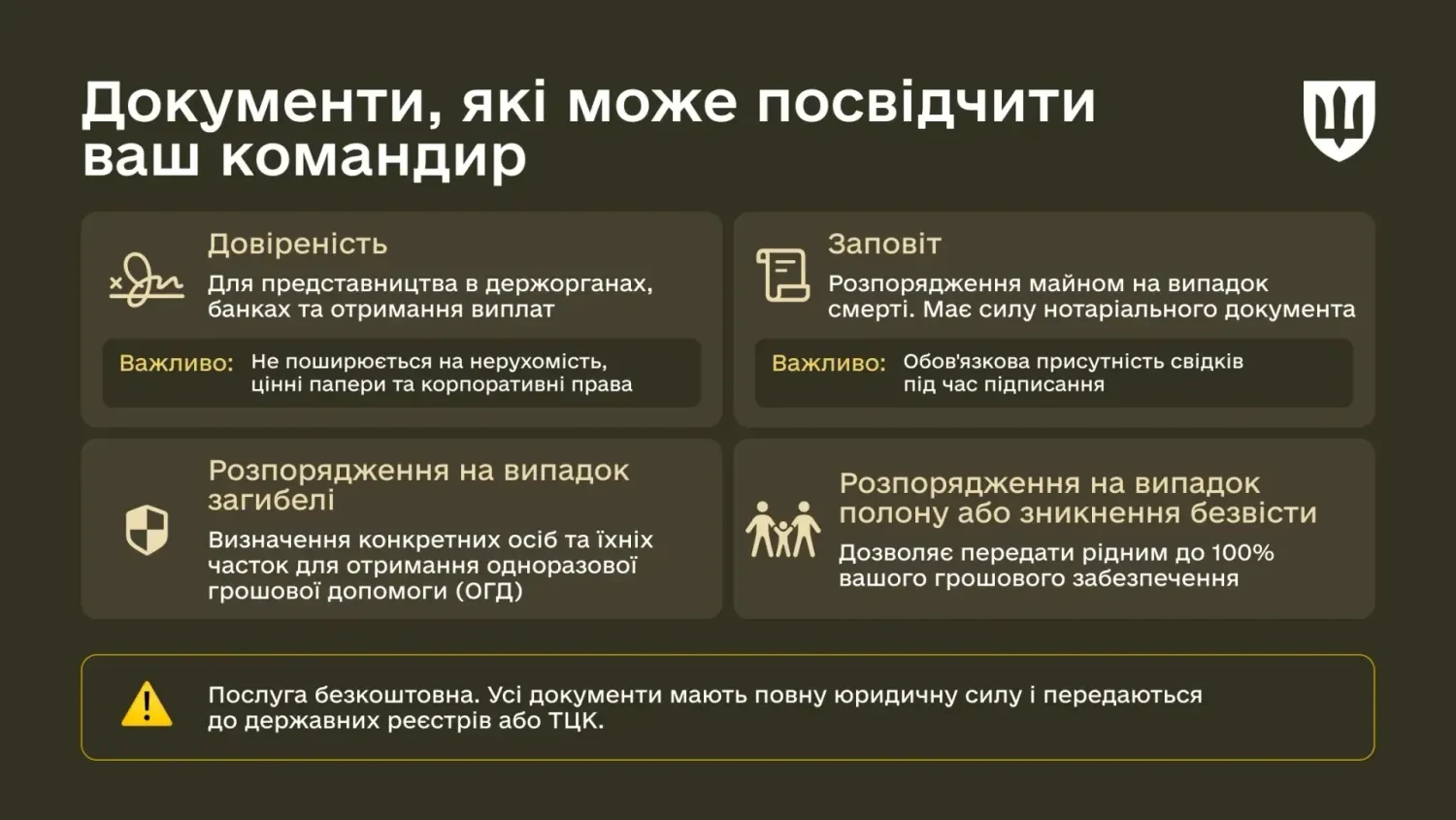 В умовах ведення бойових дій військовослужбовці часто не мають фізичної можливості відвідати нотаріуса. Повноваження командира усувають цей бар'єр: захисник може прямо на місці служби (без поїздок, черг і держмита) оформити документи з повною юридичною силою.