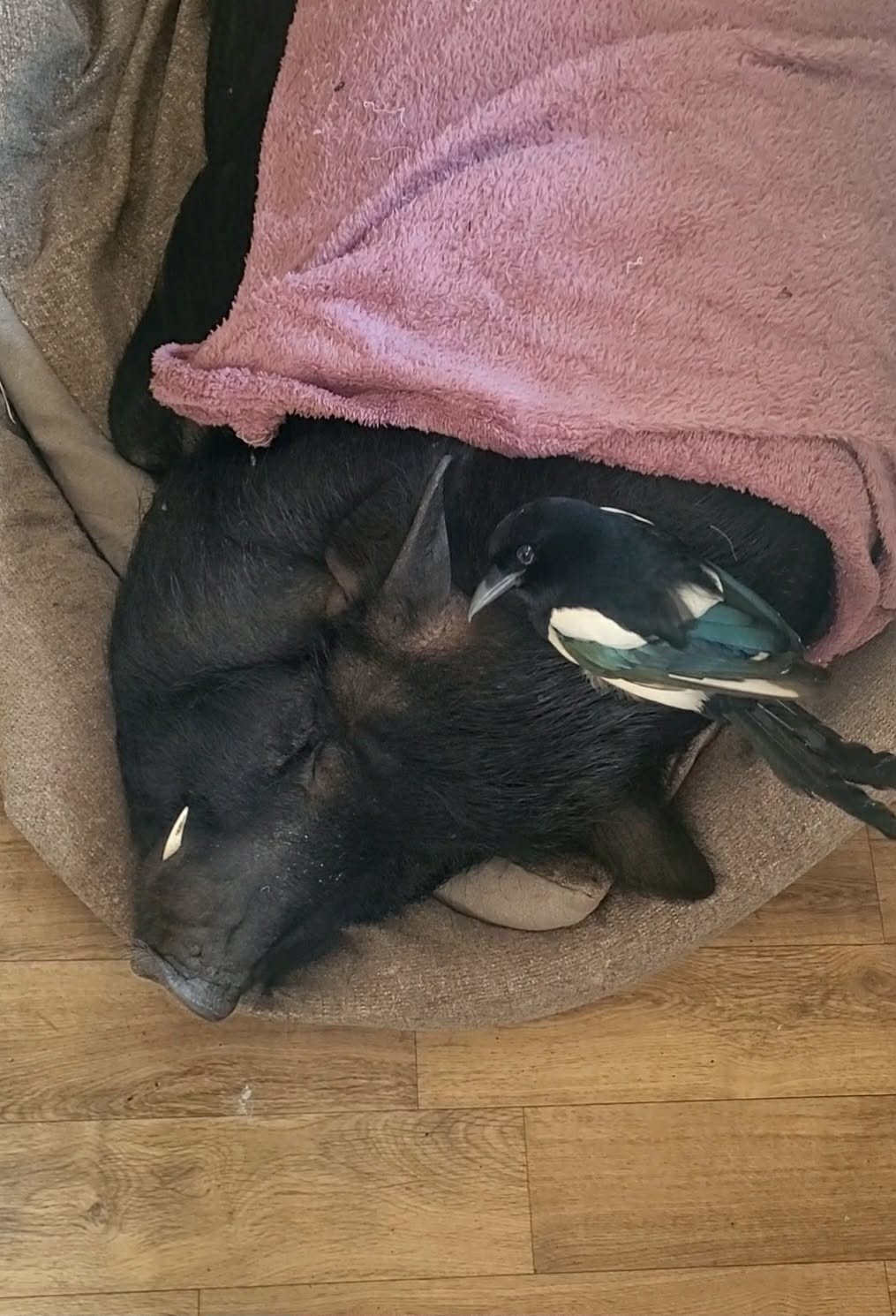 Попри те, що кабанчик любить м’ясо, птахів він не чіпає. Він виріс поруч із ними і сприймає їх як частину своєї «зграї». Особливо подружився з однолапою сорокою та сліпим граком, які часто проводять із ним час.