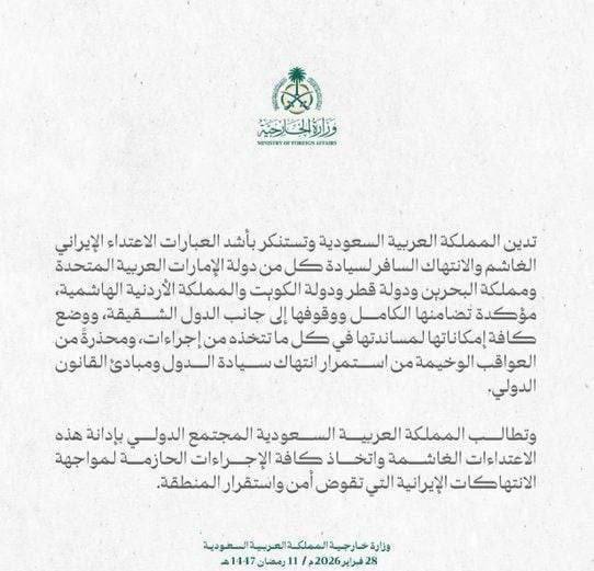 «Королівство Саудівська Аравія рішуче засуджує та викриває відверту іранську агресію та кричуще порушення суверенітету ОАЕ, Бахрейну, Катару, Кувейту та Йорданії. Королівство підтверджує свою повну солідарність та непохитну підтримку братніх країн, а також готовність надати всі свої можливості в їхнє розпорядження для підтримки будь-яких заходів, які вони можуть вжити», – йдеться у заяві МЗС.