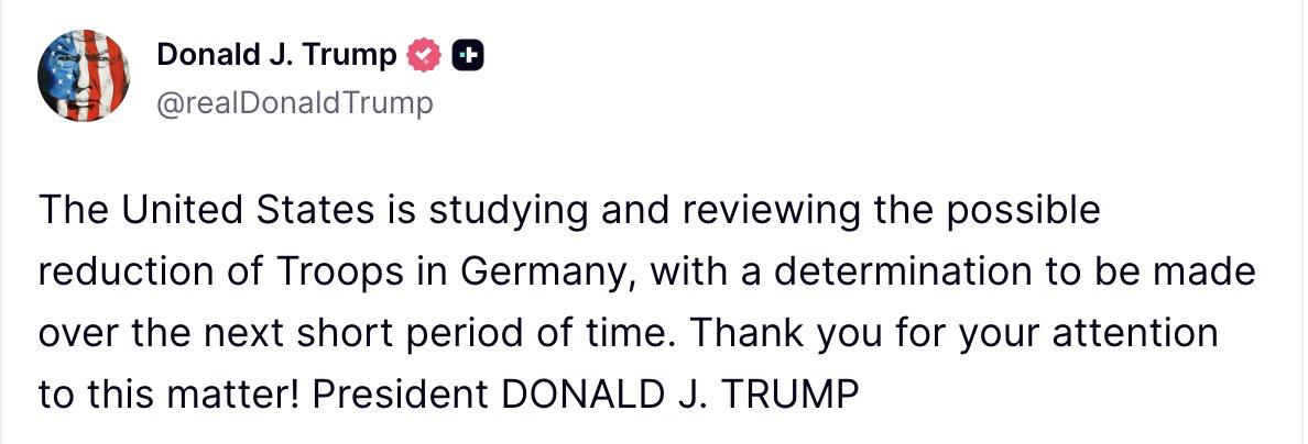 «Сполучені Штати вивчають та розглядають можливе скорочення військ у Німеччині, і протягом наступного короткого періоду часу буде прийнято рішення щодо цього питання», – заявив він.