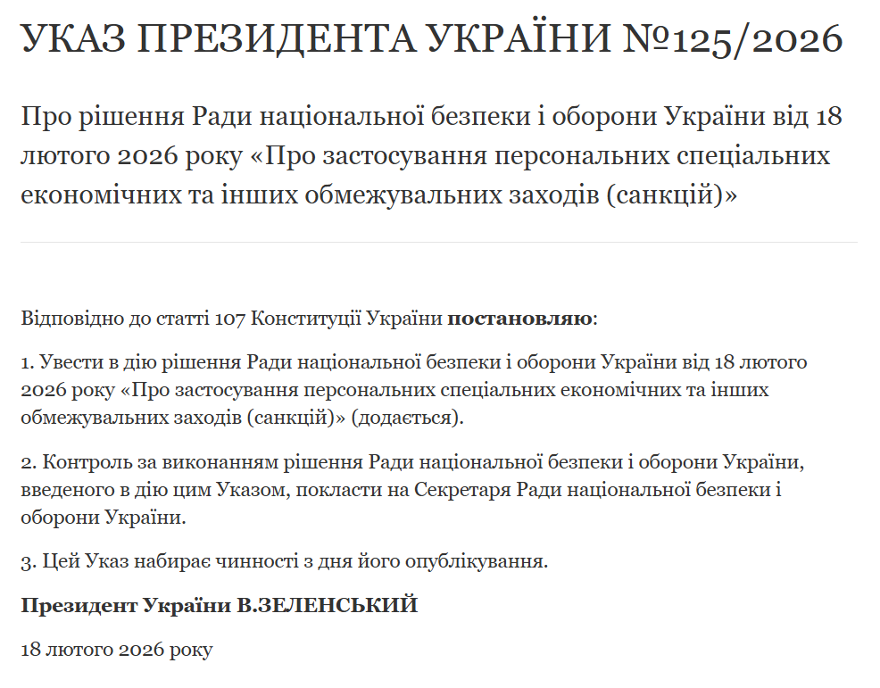 Президент України Володимир Зеленський увів в дію рішення Ради національної безпеки і оборони України від 18 лютого 2026 року «Про застосування персональних спеціальних економічних та інших обмежувальних заходів (санкцій)». Санкції введено проти самопроголошеного президента Білорусі Олександра Лукашенка. Про це повідомляє «Главком» з посиланням на указ глави держави №125/2026.