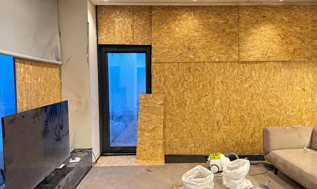 На опублікованому фото видно, що діри на місці скляних вікон затуляють листи тирсоплит.